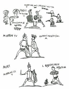 Velen die de graffiti maakten hielden nauwkeurig "de stand" bij van de gladiatoren, hun aantal wedstrijden, overwinningen, etc.