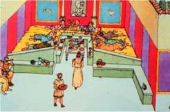 Vanzelfsprekend lagen op de bedden vroeger zachte kleden en kussens. (Zie bv. de fresco's hierboven.)