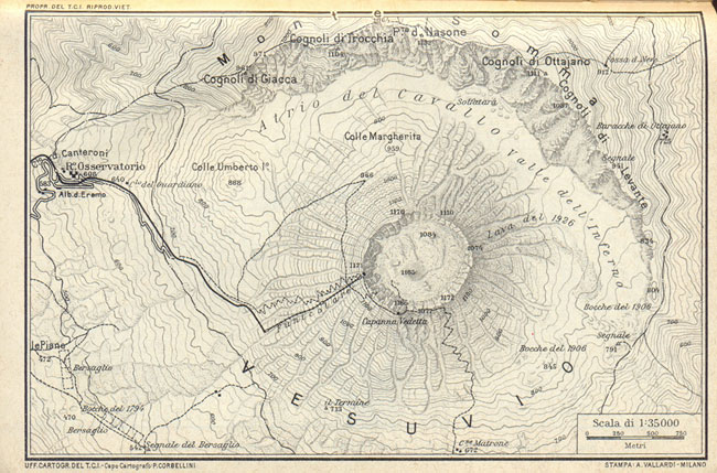 hoogte van de vulkaan. Voor 1906 was de Vesuvius 1336m hoog. Na de uitbarsting in 1906 was de vulkaan opeens nog maar 1186m.